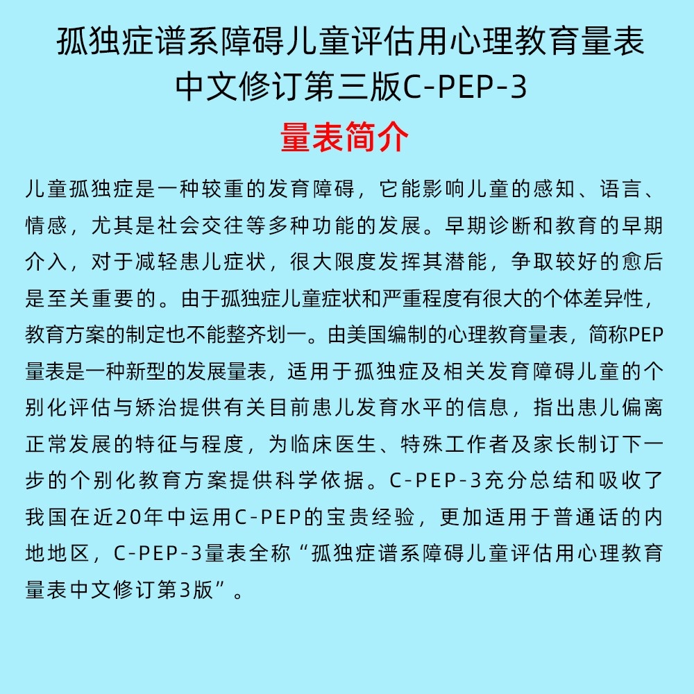 兒童孤獨癥是一種較重的發(fā)育障礙,它能影響兒童的感知、語言、情感,尤其是社會交往等多種功能的發(fā)展。早期診斷和教育的早期介入,對于減輕患兒癥狀,很大限度發(fā)揮其潛能,爭取較好的愈后是至關(guān)重要的。由于孤獨癥兒童癥狀和嚴(yán)重程度有很大的個體差異性,教育方案的制定也不能整齊劃一。由美國編制的心理教育量表,簡稱PEP量表是一種新型的發(fā)展量表,適用于孤獨癥及相關(guān)發(fā)育障礙兒童的個別化評估與矯治提供有關(guān)目前患兒發(fā)育水平的信息,指出患兒偏離正常發(fā)展的特征與程度,為臨床醫(yī)生、特殊工作者及家長制訂下一步的個別化教育方案提供科學(xué)依據(jù)。C-PEP-3充分總結(jié)和吸收了我國在近20年中運用C-PEP的寶貴經(jīng)驗,更加適用于普通話的內(nèi)地地區(qū),C-PEP-3量表全稱“孤獨癥譜系障礙兒童評估用心理教育量表中文修訂第3版”。